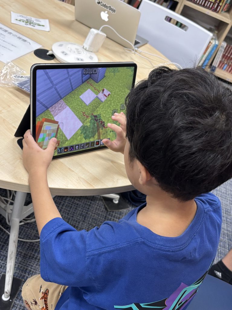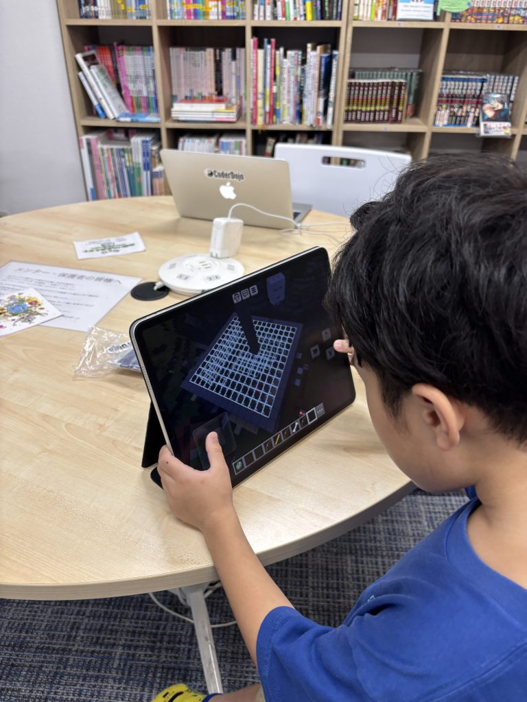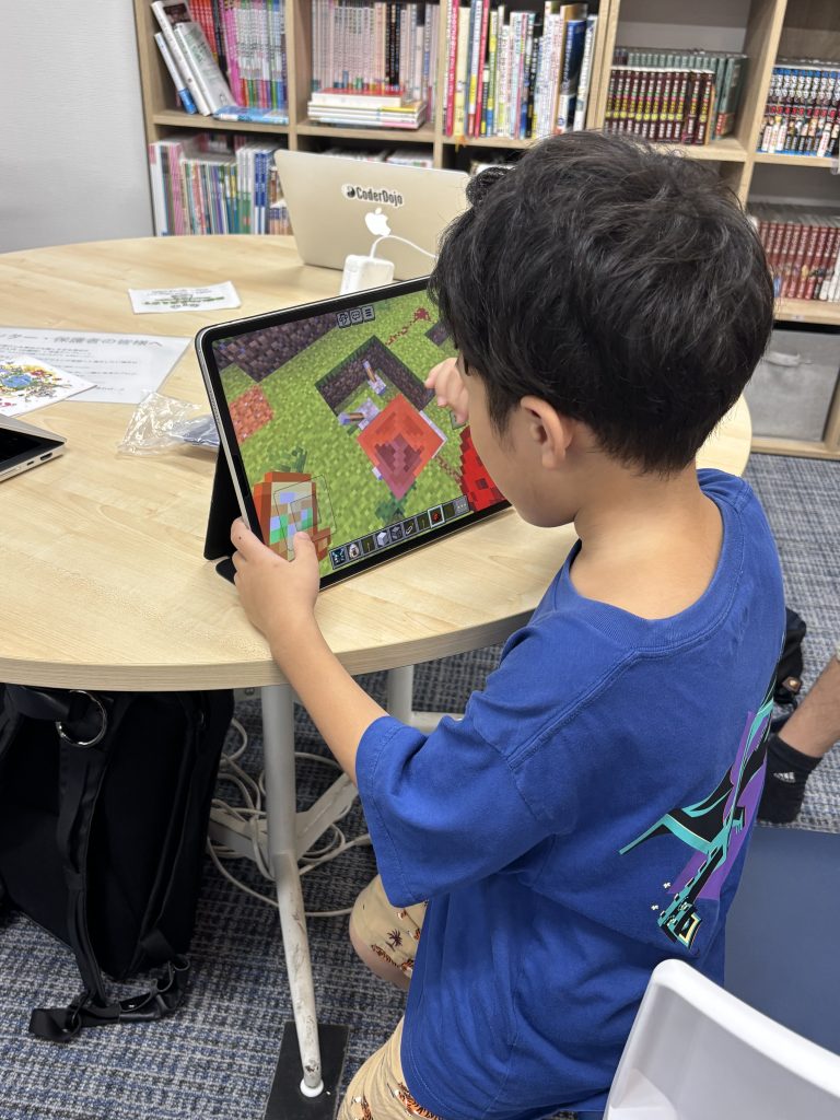 傍では、いつものように黙々とプログラミングする中学生、初参加でマイクラ大好き小学生も。同じ空間で、それぞれ好きなことをして、お互いの作品の感想も言い合える、公園のような空間がCoderDojo品川御殿山です!